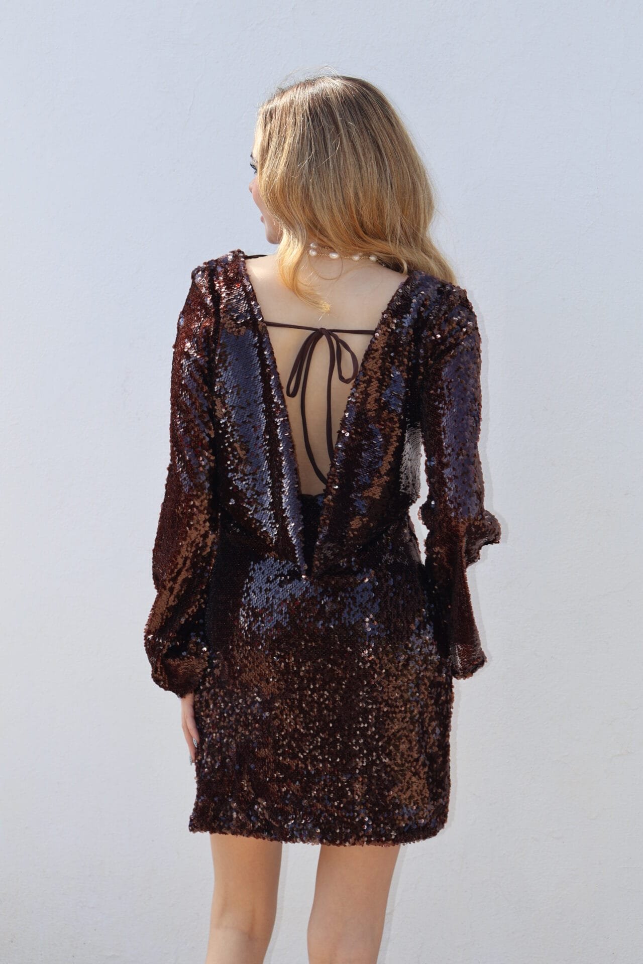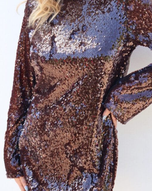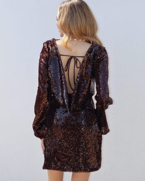 Vestido corto manga larga de lentejuelas cafe oscuro